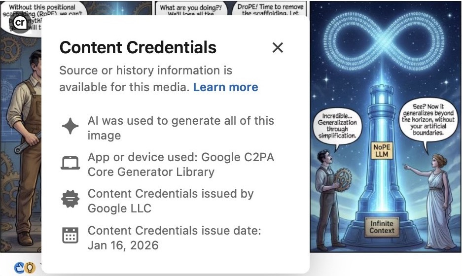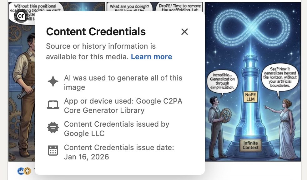C2PA Content Credentials: signed provenance metadata that can be displayed by platforms (for example through the “cr” icon on LinkedIn).