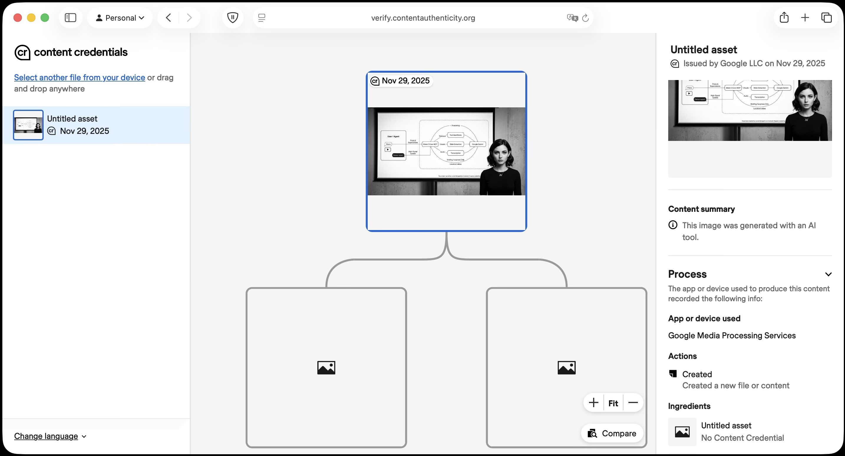 However, in the extracted JSON these ingredients did not resolve to titles or thumbnails, and I could not match them to local input images by hash. In practical terms, this makes the provenance graph visible (”there were inputs”) without enabling a third party to confirm what those inputs were.